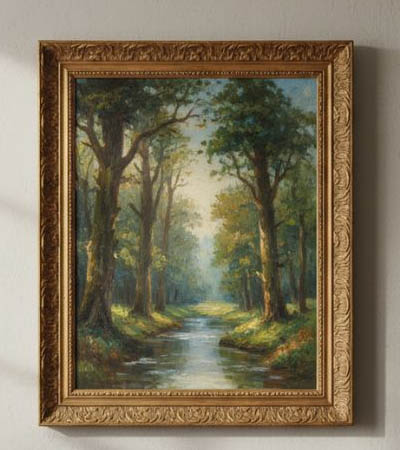 In Whispers of the Woodland Stream, the artist captures a tender communion between light and nature — a tranquil forest where morning sunlight filters through towering trees, illuminating a gentle stream that meanders like time itself. Each brushstroke evokes the hush of solitude, where silence becomes symphonic and nature breathes with quiet grace. The muted greens and earthy browns reveal not just a landscape but a reflection of serenity — a passage into stillness where memory and imagination drift together.
